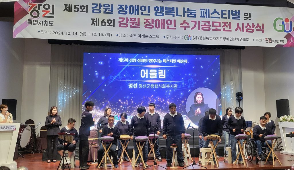 정선군종합사회복지관(관장 주상현 안젤로 신부)의 ‘어울드럼’ 팀이 강원특별자치도 속초시 마레몬스 호텔 그랜드 볼룸홀에서 10월 14일부터 15일까지 이틀간 개최된 ‘제5회 강원장애인행복나눔페스티벌’ 에 참가했다.