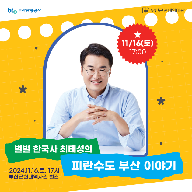 부산근현대역사관(이하 역사관)은 오는 11월 16일 오후 5시 인문학 복합문화공간인 역사관 별관에서 부산관광공사와 함께 최태성 강사의 <역사 토크 콘서트>를 개최한다고 밝혔다.