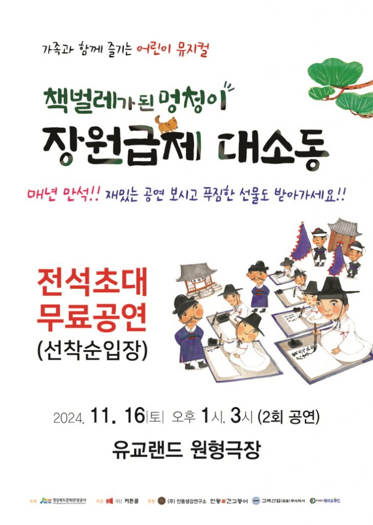 창작어린이뮤지컬『책벌레가 된 멍청이 장원급제 대소동(극단 커튼콜)』이 11월 16일 안동 유교랜드 원형극장에서 공연된다.