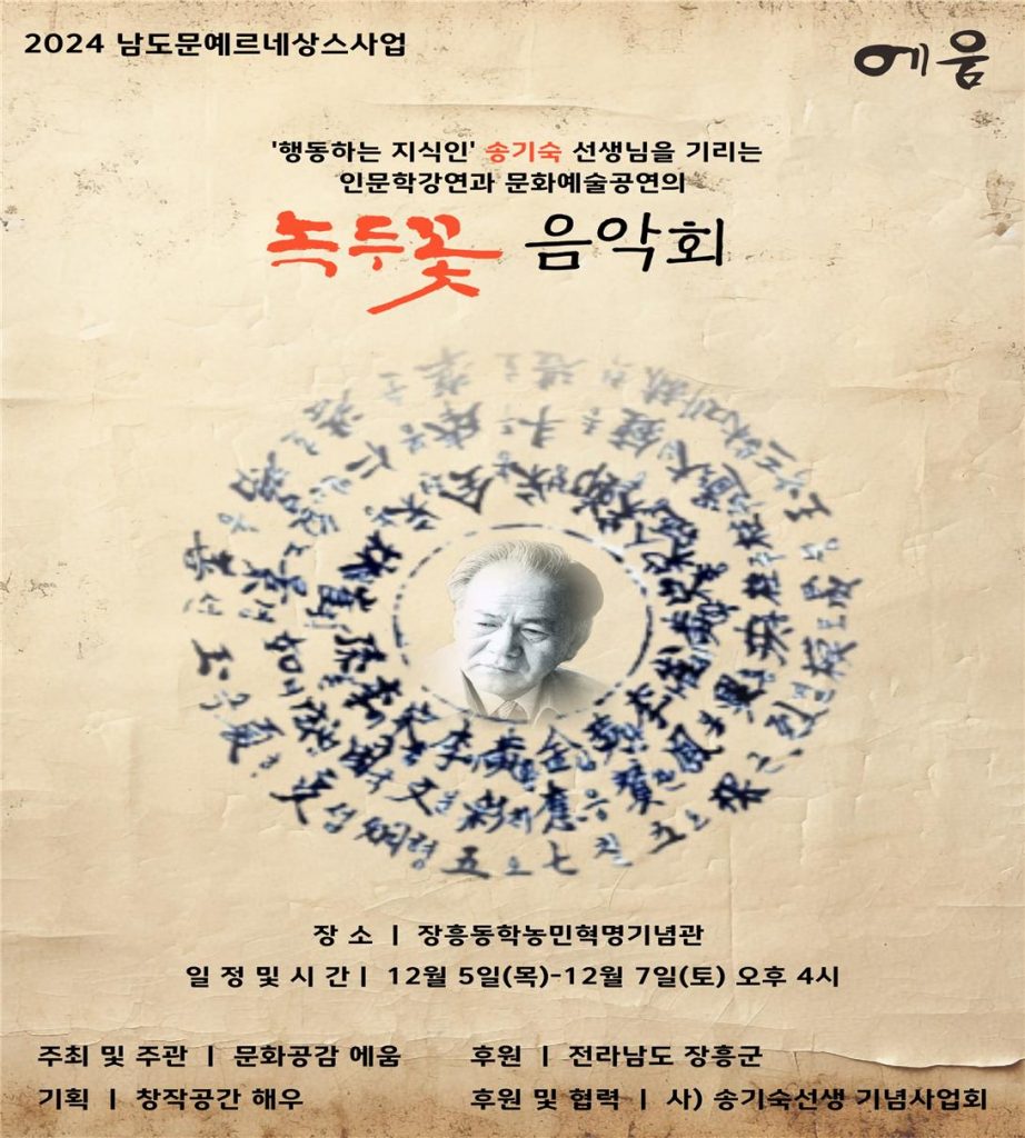 장흥군은 오는 5일부터 7일까지 장흥동학농민혁명기념관에서 고 송기숙 작가의 ‘녹두꽃 음악회’를 개최한다고 밝혔다.