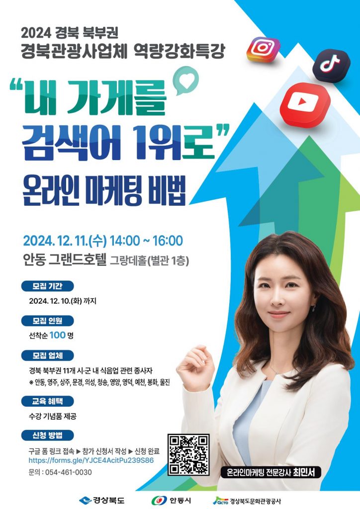 안동시 및 경상북도문화관광공사(사장 김남일, 이하 공사)는 관광거점도시 육성사업의 일환으로 오는 11일 경북 북부권 관광사업체 식음업 종사자들을 대상으로 ‘2024년 경북 북부권 경북관광사업체 역량강화 특강’을 개최한다고 밝혔다.