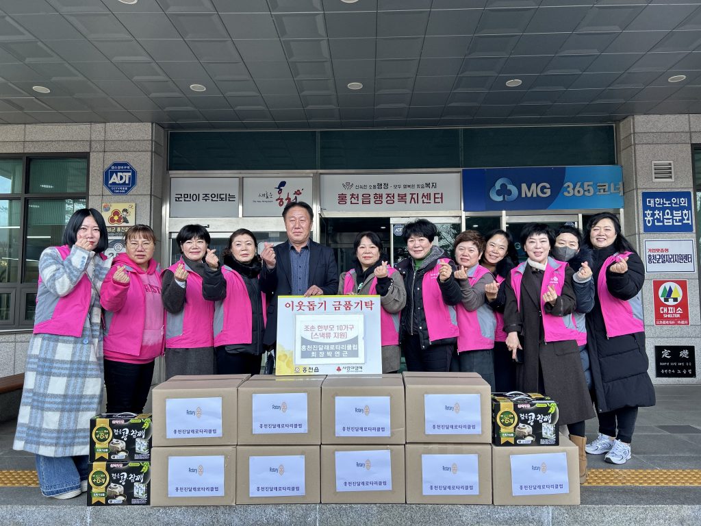 홍천진달래로타리클럽(회장 박연근)은 12월 18일 홍천읍행정복지센터(읍장 박만성)에서 조손, 한부모가정 10가구를 추천받아 학생 맞춤형 과자 꾸러미 등 10세트를 구성해 직접 학생 가정을 방문하여 선물했다.