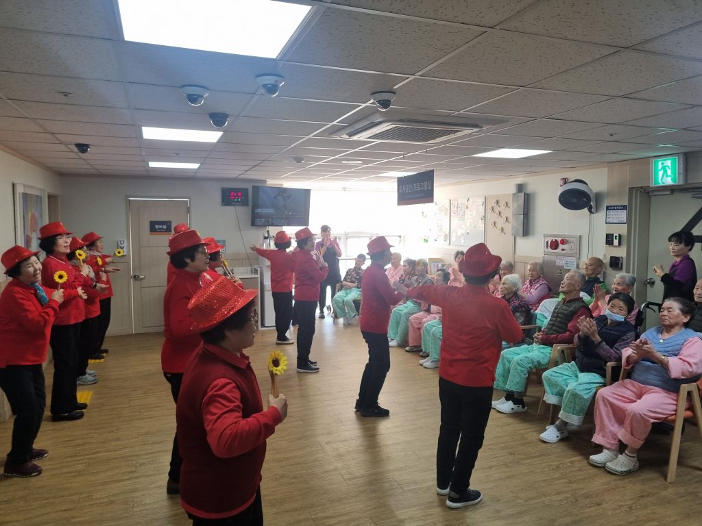 종합사회복지관 숟가락 난타 수강생은 13명 음악에 맞춰 숟가락을 이용한 리듬과 퍼포먼스를 펼치고, 자원봉사센터 소속 봉사단 8명은 하모니카 연주 등 활기찬 공연을 선보여 관람하는 어르신들과 요양원 관계자들로부터 많은 박수와 환호를 받았다.