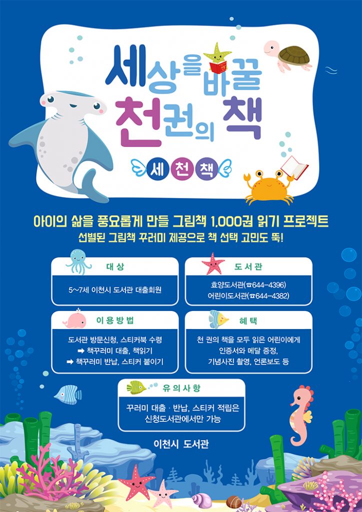 어린이도서관 세천책은 2019년~2021년생으로 이천시 도서관 회원이라면 누구나 참여할 수 있다. 세천책 도전용으로 선별된 그림책은 5권씩 200개의 가방에 담겨 꾸러미 단위로 제공된다. 어린이 대출증을 가지고 어린이도서관 1층 새싹자료실에 방문해 신청서를 작성하면 바로 세천책 꾸러미를 빌릴 수 있다.