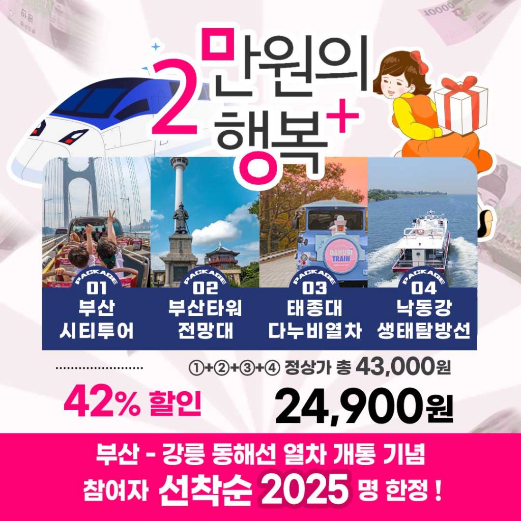 부산관광공사가 부산과 강릉을 잇는 동해선 열차(ITX-마음) 개통 기념 및 다가오는 명절 연휴 기간 특별 프로모션으로 이만원의 행복 플러스 상품을 선착순 한정 판매한다고 밝혔다