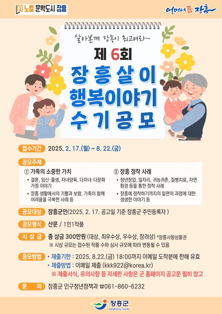 장흥군이 ‘제6회 장흥살이 행복이야기 「살아본께 장흥이 최고여라」’ 수기 공모를 2월 17일부터 8월 22일까지 접수한다고 밝혔다.