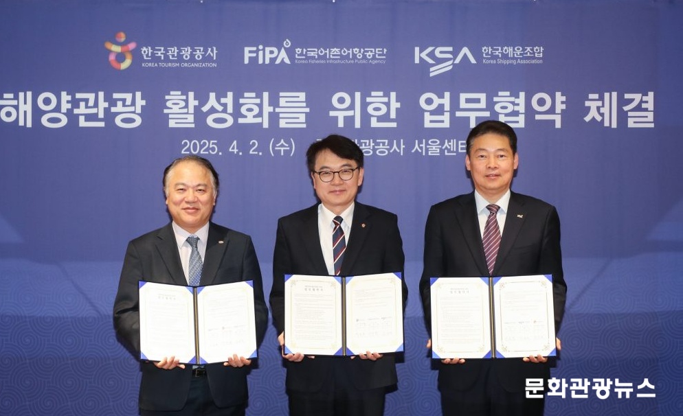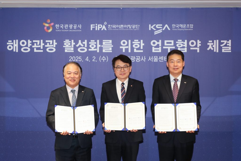 한국관광공사(사장 직무대행 서영충, 이하 공사)는 4월 2일 해양관광 활성화를 위한 협력체계를 강화하고자 한국어촌어항공단(이사장 홍종욱) 및 한국해운조합(이사장 이채익)과 3자간 업무협약을 체결했다.