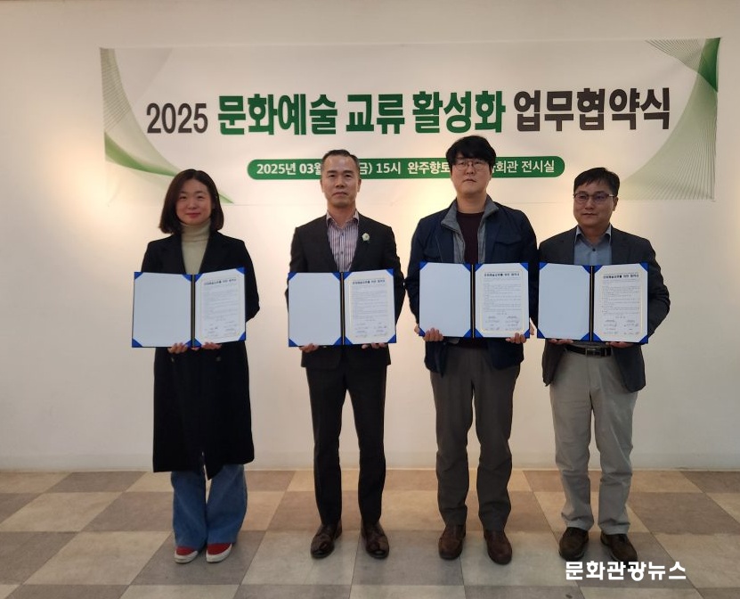 전북 완주군 완주향토예술문화회관 공연장 로비에 관계자들이 한자리에 모였다. 지난 3월 28일 열린 문화예술 교류 협약식에서는 지역 간 경계를 넘어 공연을 잇겠다는 약속이 오갔다.