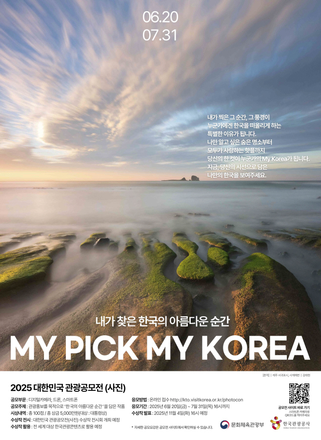 한국관광공사(사장직무대행 서영충, 이하 공사)는 ‘2025 대한민국 관광공모전’ 사진 부문 참가작을 오는 6월 20일부터 7월 31일까지 공개 모집한다.