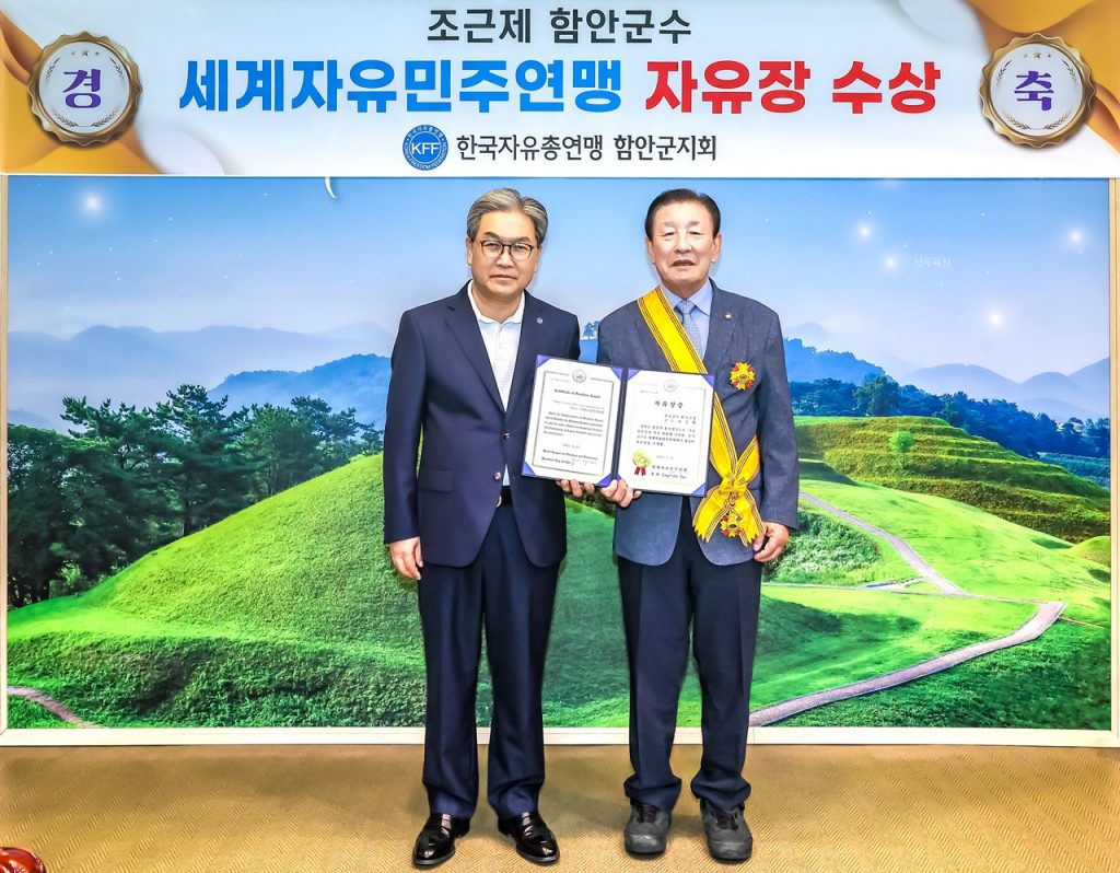 조 군수는 수상 소감에서 “이 상은 함안군민 모두가 함께 이룬 성과”라며 “앞으로도 자유민주주의를 바탕으로 군민 삶의 질 향상과 함안의 지속 가능한 발전을 위해 최선을 다하겠다”고 밝혔다.