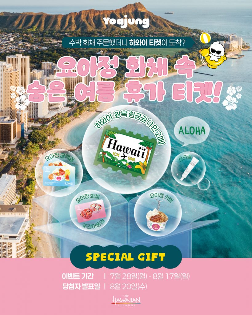 응모자 중 추첨을 통해 ▲하와이 왕복 항공권(1인 2매) ▲요아정 화채 주간 이용권 ▲요아정 금액권 ▲선크림 ▲요아정 키링 등 다양한 경품이 증정된다. 당첨자는 오는 8월 20일 개별 안내될 예정이다.