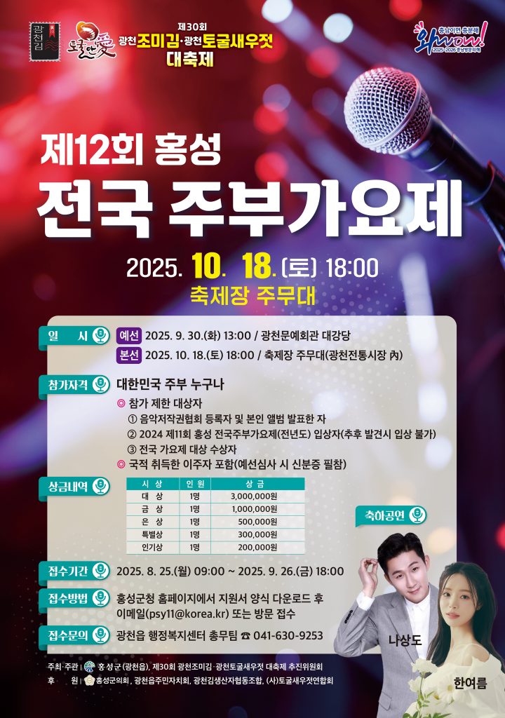 한편, 이번 주부가요제는 10월 18일부터 20일까지 열리는 「제30회 광천조미김·광천토굴새우젓 대축제」의 서막을 장식할 예정이다.