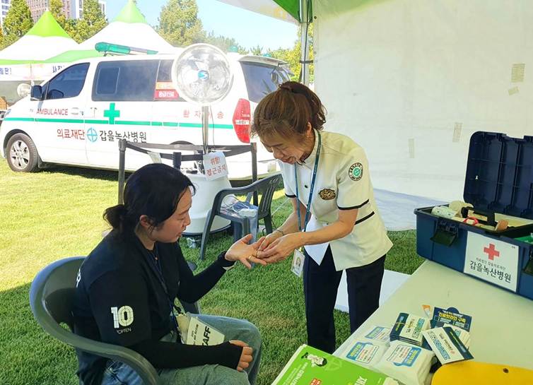 갑을녹산병원은 행사 기간 혹시 발생할 수 있는 응급 상황에 대비해 의료팀을 배치하고, 환자 발생 시 즉시 치료가 가능한 구급차와 의료부스를 운영했다.