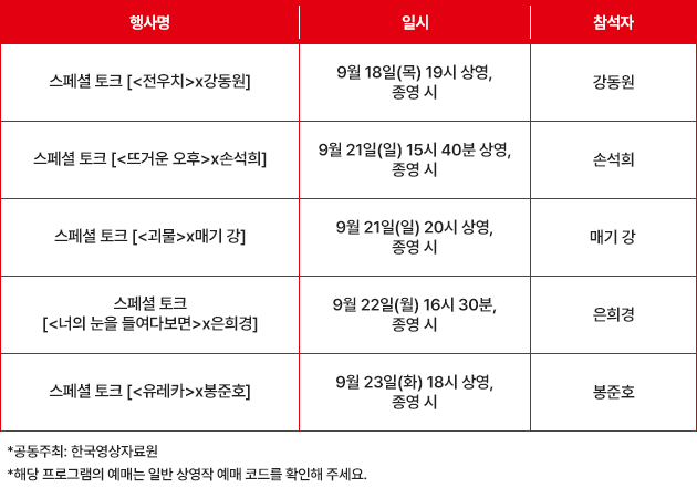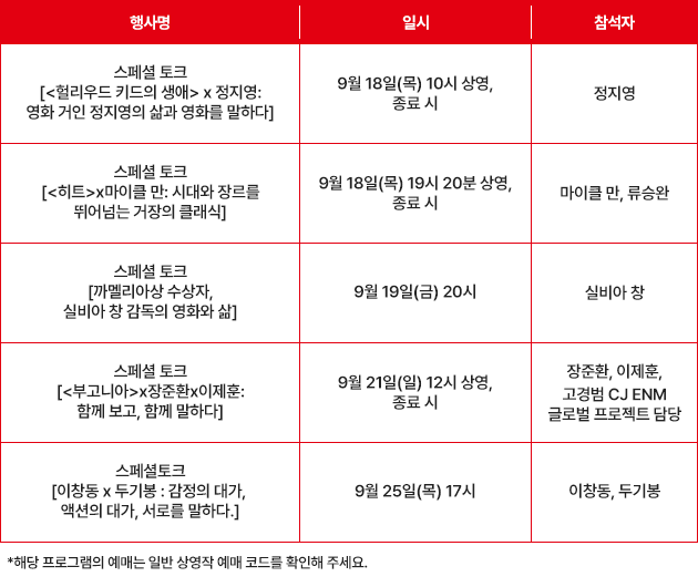 상영 이후 감독·배우와 함께 심도 깊은 대화를 나누는 ‘스페셜 토크’에는 정지영, 마이클 만, 실비아 창, 이창동, 두기봉, 장준환, 이제훈, 류승완 등이 참여한다. 작품의 의미와 창작 과정에 대한 다양한 이야기가 펼쳐질 것으로 기대된다.