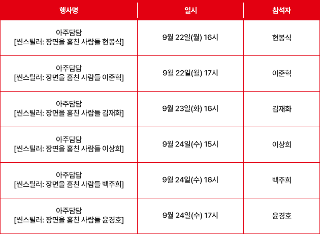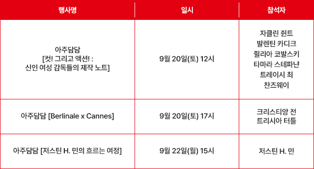 국내외 대표 배우들이 연기 철학과 삶을 전하는 ‘액터스 하우스’에는 이병헌, 손예진, 니노미야 카즈나리, 김유정이 나서 관객과 진솔하게 소통한다. 또한 ‘아주담담’은 씬스틸러 배우들의 이야기, 신인 여성 감독들의 제작 경험, 글로벌 영화제 교류 등 폭넓은 주제로 진행된다.