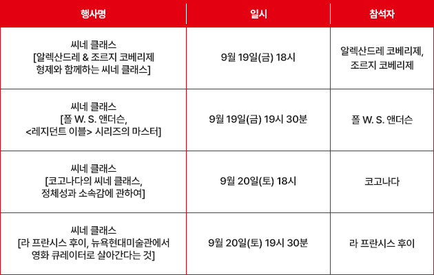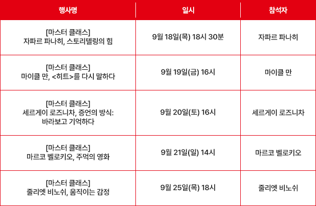 세계적 거장들이 직접 강연하는 ‘마스터 클래스’도 주목된다. 마르코 벨로키오, 마이클 만, 세르게이 로즈니차, 자파르 파나히, 줄리엣 비노쉬가 참여해 영화 예술과 인생관을 나눈다. 여기에 코고나다, 폴 W. S. 앤더슨, 알렉산드레, 조르지 코베리제 형제, 라 프란시스 후이 등이 참여하는 ‘씨네 클래스’에서는 영화와 사회적 맥락을 읽어내는 새로운 시각이 제시된다.