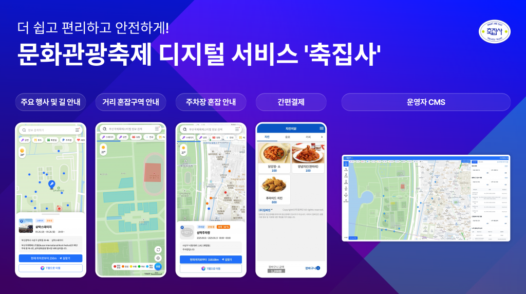 또한 축집사는 주차 혼잡도 정보 제공, 모바일 음식 주문·결제, 휠체어 대여소, 장애인 화장실·경사로 등 무장애 동선 안내 등 다양한 기능을 지원해 모두가 편리하게 축제를 즐길 수 있도록 설계됐다.