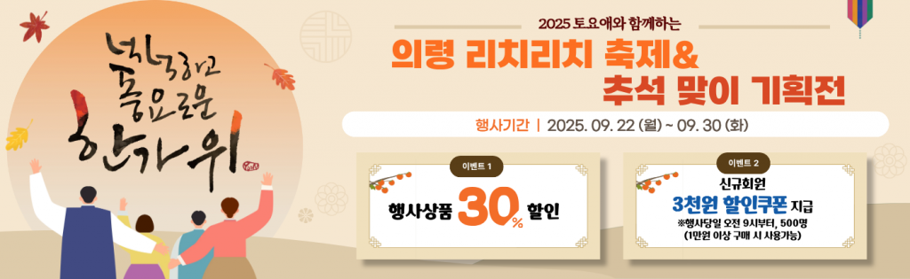 의령군이 오는 22일부터 30일까지 공식 쇼핑몰 ‘토요애’에서 리치리치 페스티벌과 추석맞이 기획전을 진행한다. 행사 기간 전 상품이 30% 할인되며, 회원 가입 시 3,000원 쿠폰 지급과 무료배송 혜택도 제공된다.