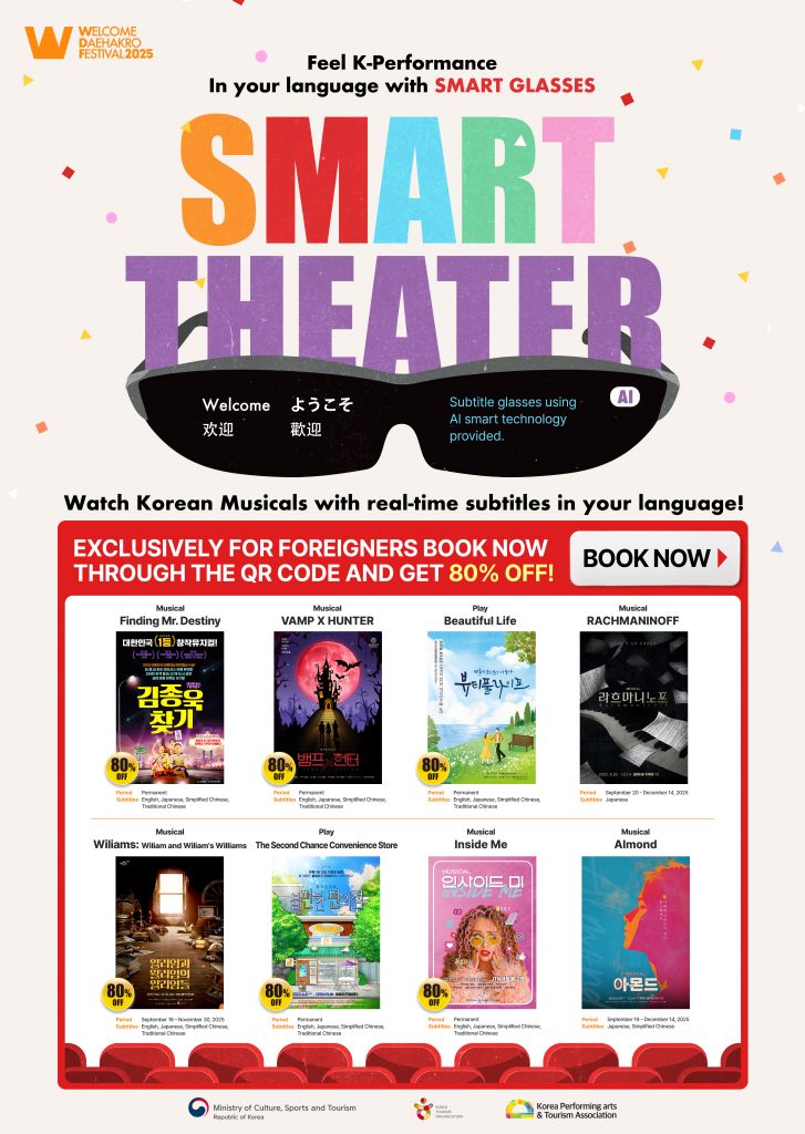 외국인 관광객의 공연 관람 접근성을 높이기 위해 ‘스마트씨어터’도 올해 처음 도입된다. AI 기반 스마트 글래스를 통해 실시간으로 외국어 자막을 제공하며, 티켓 가격은 최대 80%까지 할인된다.