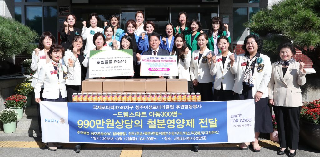 청주시 국제로타리3740지구 소속 9개 여성로타리클럽이 17일 청주시청을 방문해 드림스타트 아동을 위한 영양제를 기탁했다. 이번 후원은 성장기 아동의 발육 부진과 영양 불균형 해소를 위해 마련됐으며, 총 990만 원 상당의 철분 영양제가 300명에게 전달된다.