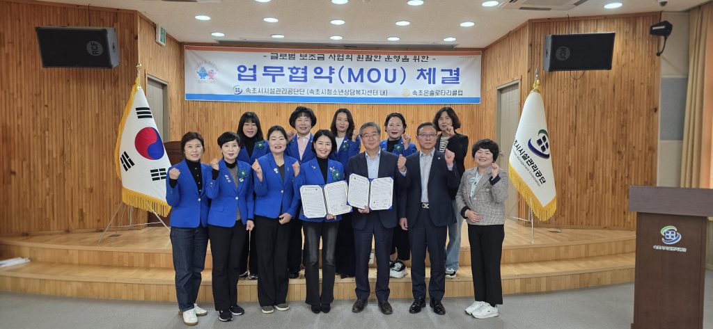 속초시시설관리공단(이사장 김태균)과 속초은솔로타리클럽(회장 이경희)은 지난 22일 오후 2시, 속초시청소년수련관 2층 대회의실에서 ‘글로벌 보조금’ 사업의 원활한 추진을 위한 업무협약(MOU)을 체결했다.