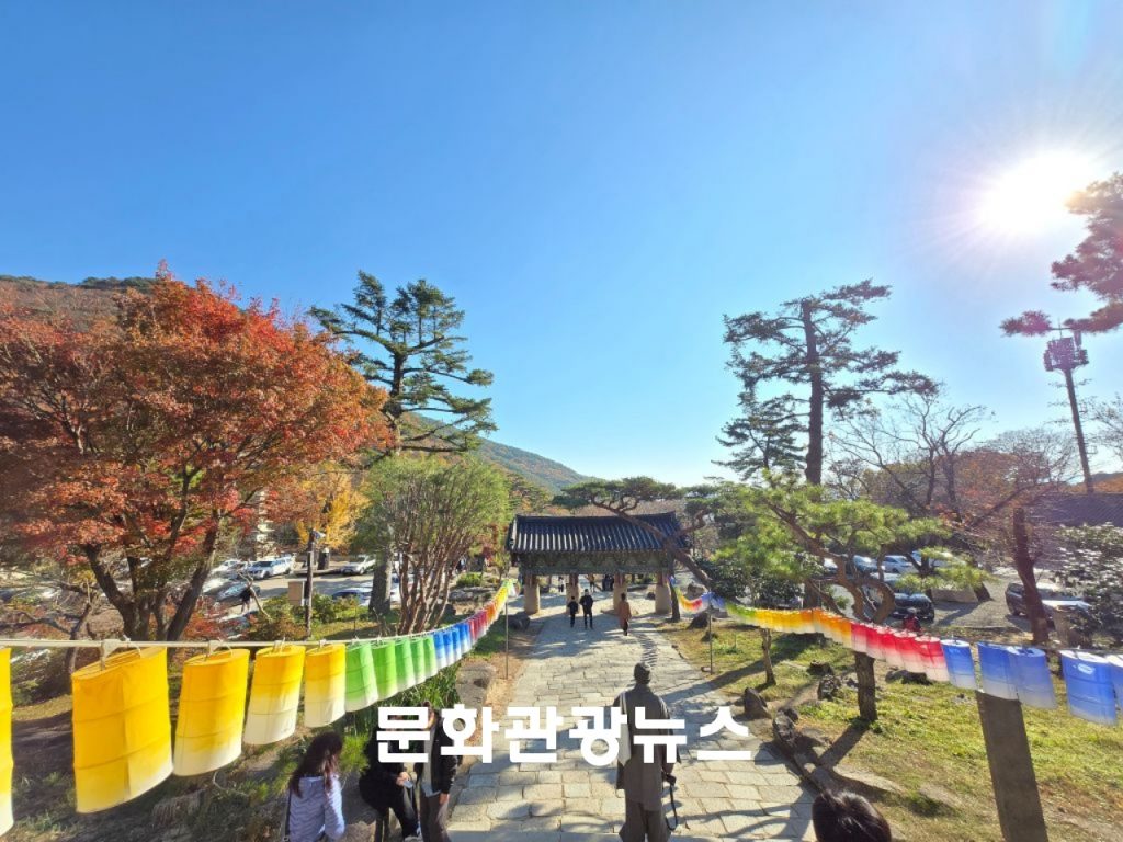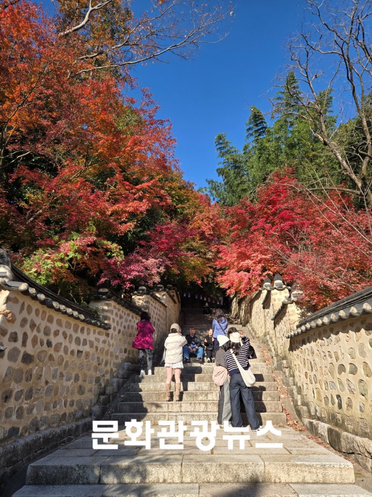 소원을 기원하는 신도들은 고즈넉한 산사의 풍경을 무심히 지나치지만, 관광객들은 단풍길 곳곳에서 포토존을 찾아 휴대폰 카메라에 추억을 담느라 분주하다.