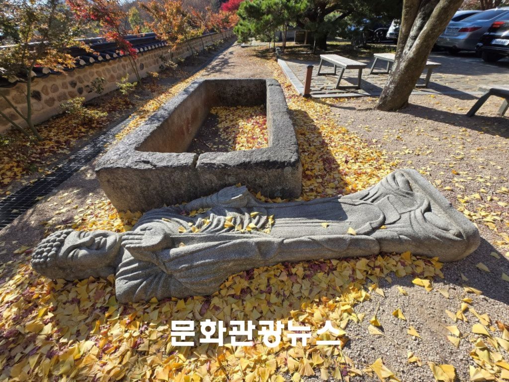 가을이 품은 부산 범어사 와불. 한적한 곳에 자리를 잡고 가을빛에 덮인 와불은 고요히 누워 온 세상의 평화를 품고 있다.