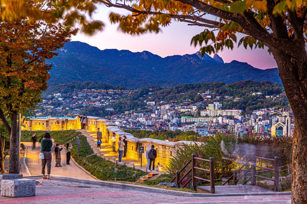 낙산공원은 서울의 동쪽을 지키는 성곽의 요새이자, 오늘날엔 젊음과 예술, 그리고 감성이 살아 숨 쉬는 문화의 언덕이다. 이곳은 조선의 역사가 깃든 장소이면서, 영화 ‘케이팝 데몬헌터스(K-pop Demon Hunters)’가 상상한 서울의 환상 세계와 가장 가까운 현실 무대이기도 하다. 낙산은 해발 125m의 낮은 산이지만, 정상에서 바라보는 서울의 풍경은 압도적이다. 성곽길을 따라 걸으면 돌벽 위로 수백 년의 시간이 흐르고, 그 아래에는 현대 서울의 불빛이 파도처럼 번진다. 낮에는 고즈넉한 역사 산책길이지만, 밤이 되면 마치 다른 차원으로 진입한 듯한 분위기로 변한다. 이 풍경은 ‘케데헌’ 속 장면을 떠올리게 한다. 전통의 유적지와 네온 조명이 공존하고, 고대의 영혼과 케이팝의 리듬이 충돌하는 세계. 그 상상의 서울이 바로 낙산의 풍경 속에 살아 있다. 옛 성곽 위로 비치는 조명, 그리고 도시에서 들려오는 음악의 잔향, 이곳은 마치 영화의 또 다른 촬영 세트장 같다.