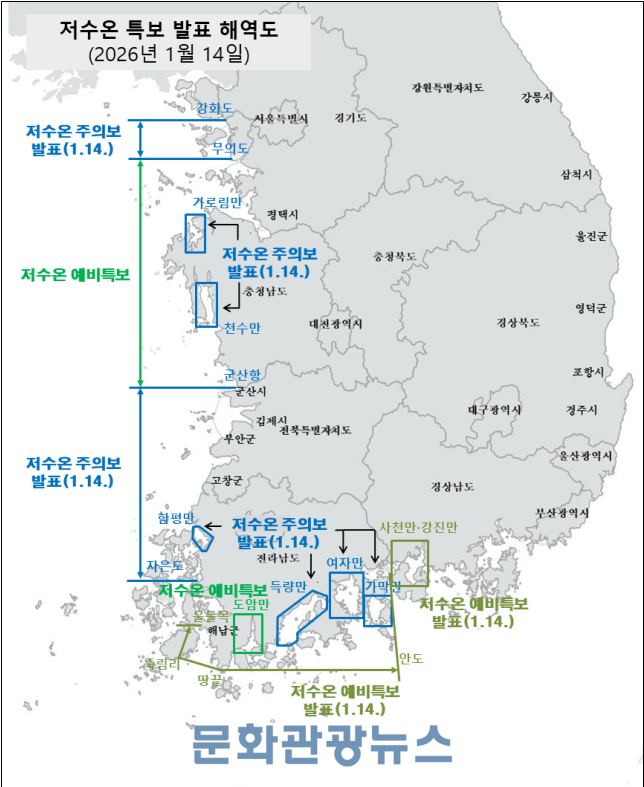 이번 조치는 국립수산과학원이 인천 연안과 충남 가로림만·천수만, 전남 함평만·득량만·가막만 등 11개 해역에 저수온 주의보를 발표한 데 따른 것이다. 해당 해역의 수온은 인천 자월도 5.0도, 충남 서산 4.0도, 전남 영광 3.7도, 여수 신월 5.9도 등으로 나타났다.