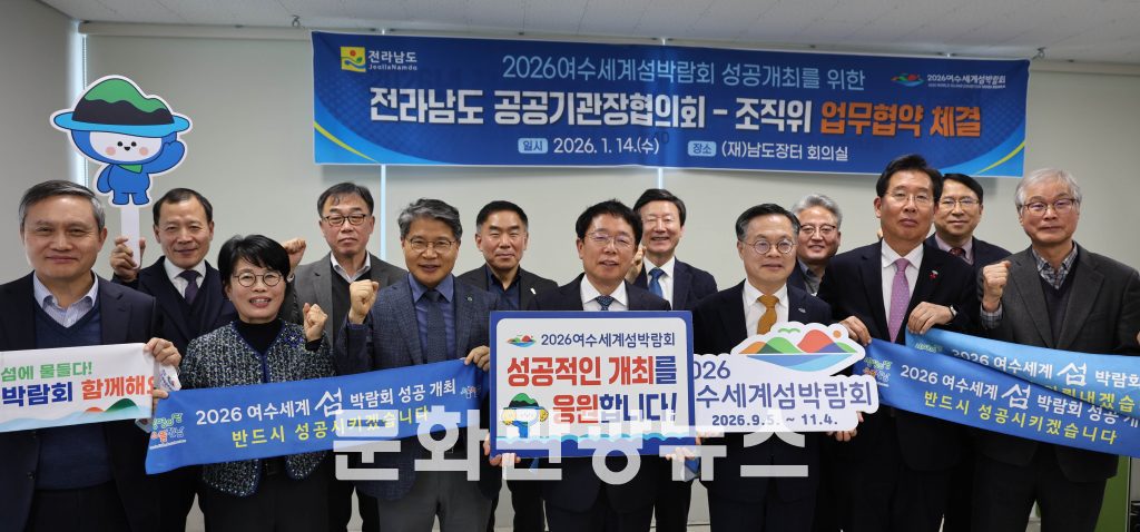 (재)2026여수세계박람회 조직위원회는 지난 14일 (재)남도장터 회의실에서 전라남도 공공기관·출연기관 기관장 협의회와 2026여수세계섬박람회 성공 개최를 위한 업무협약을 체결했다고 밝혔다.