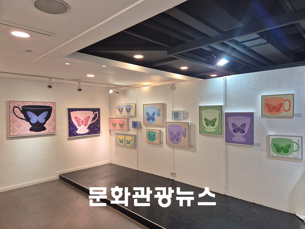 전시장에는 아크릴 재료를 사용한 회상 시리즈가 걸렸다. 화사한 발색과 단순한 이미지가 특징인 작품들은 컵과 나비를 주요 모티프로 삼고 있다. 작가에게 컵은 사물을 담는 기능을 넘어 삶의 진실함과 평온함을 상징하는 대상으로 표현된다. 화면 위에 자리한 나비는 날아오를 듯한 생동감을 더하며 즉각적인 시각적 즐거움을 전달한다.