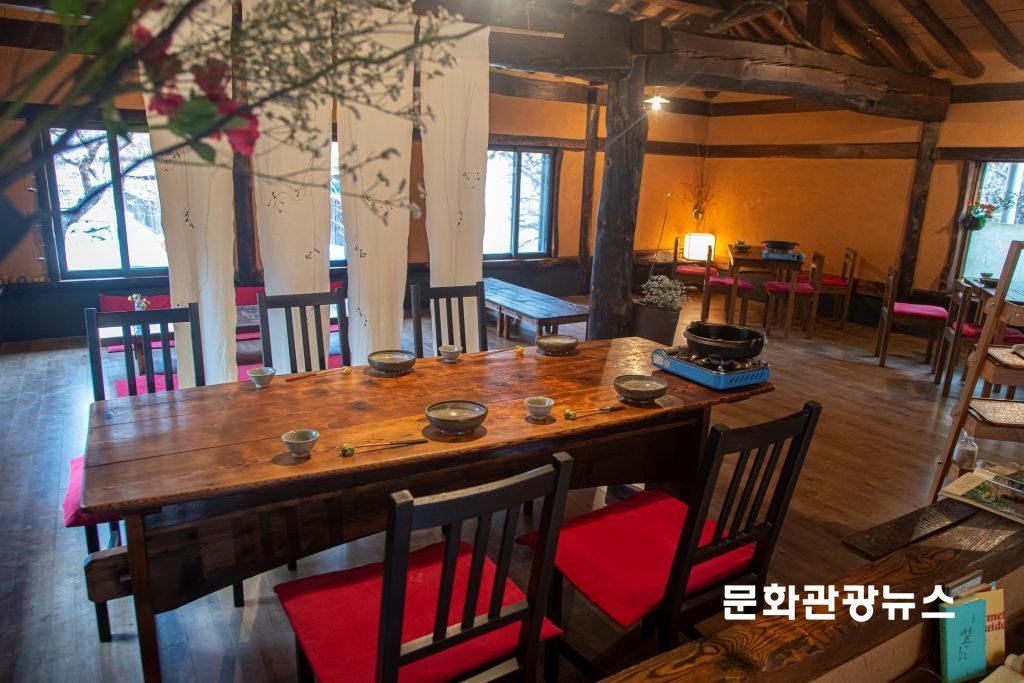 북한강을 따라 달리다 문호리에서 푯대봉 방향으로 접어들면 좁은 마을길이 이어진다. 언덕을 따라 500여 미터쯤 오르면 주변 풍경과 자연스럽게 어우러진 한옥 한 채가 모습을 드러낸다. 영화 속 장면을 떠올리게 할 만큼 고요한 분위기의 이곳이 스키야끼 전문점 ‘사각하늘’이다. 간판이 없어 사전 정보가 없다면 지나치기 쉬운 곳이지만, 일부러 숨겨둔 듯한 정취가 인상적이다.