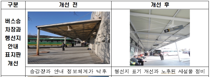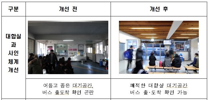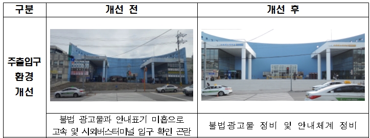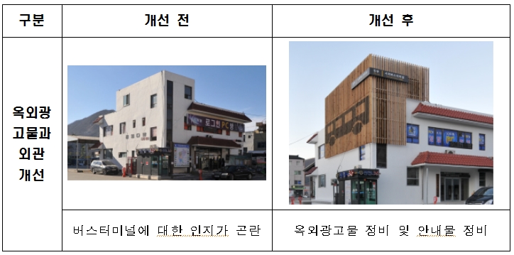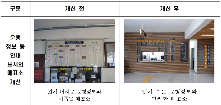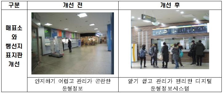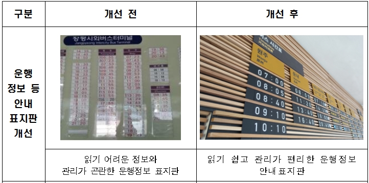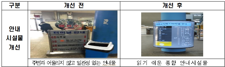 1995년부터 운영돼 왔던 강릉 버스터미널은 우리나라의 대표적인 관광지로서 국내외 방문객이 일평균 7,000여 명이 이용하는 곳이다. 이번 시범사업을 통해 처음 찾아오는 방문객들도 시외버스와 고속버스를 쉽게 이용할 수 있도록 안내표시를 개선하고 불법 옥외광고를 정비했다. 또한 버스의 출·도착 시간과 매표 정보 등을 알리는 운행정보표지판을 디지털전광판으로 교체해 정보 전달력을 높였다.
