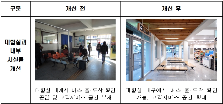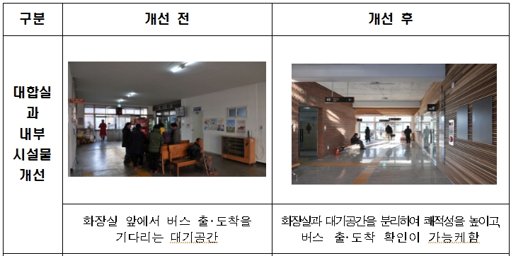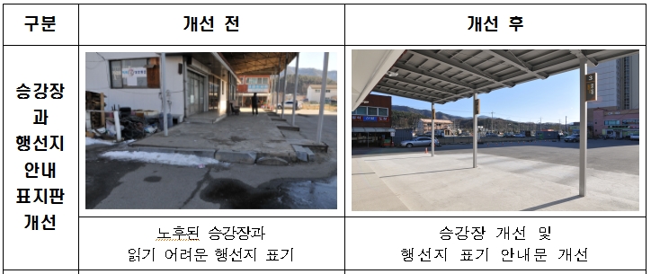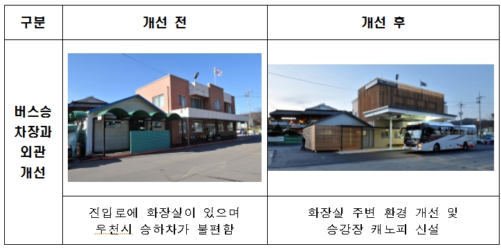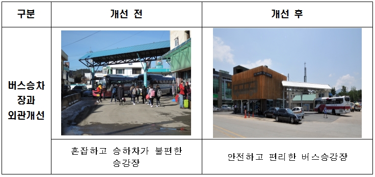 1977년과 1990년부터 운영돼 온 평창 버스터미널(횡계, 장평, 진부)은 외국인을 포함한 버스터미널 사용자들이 쉽게 찾아와 버스를 이용하고 관련 정보를 확인할 수 있도록 옥외간판과 안내표시를 개선하고 대합실‧매표소‧화장실 등 편의시설을 사용자의 요구에 맞게 재배치했다. 누구나 편안하고 쾌적하게 이용할 수 있도록 시설물의 디자인도 변경했다.